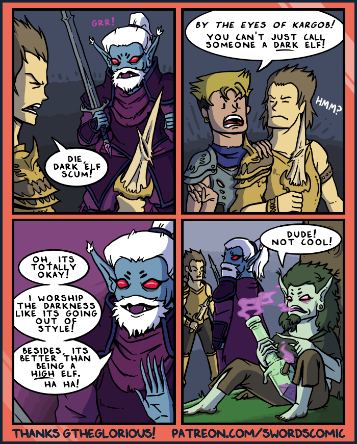 Concerned Friend: By the Eyes of Kargob! You can't just call someone a Dark Elf!