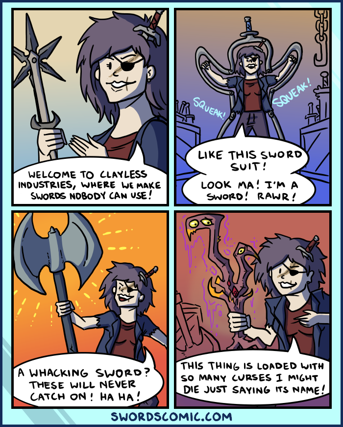 sickle: Welcome to Clayless Industries, where we make swords nobody can use!