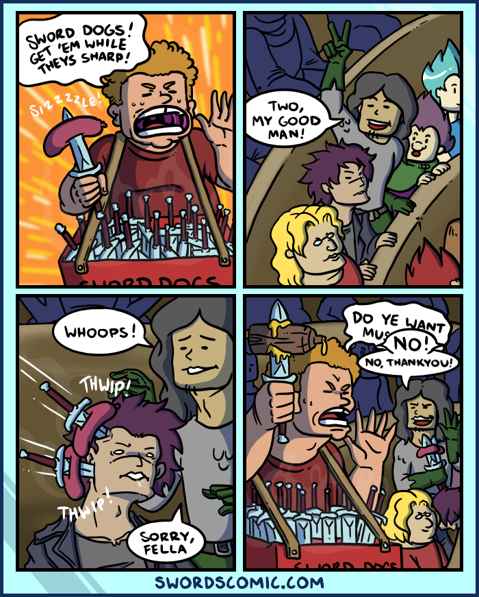 Sword dog vendor: Sword dogs! Get 'em while theys sharp!