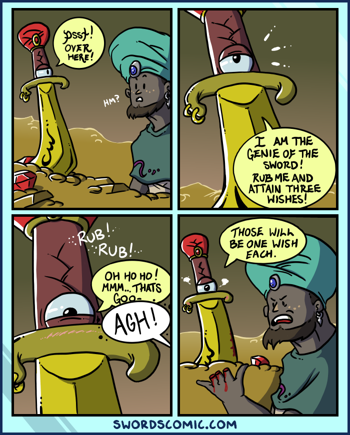 genie of the sword: I am the genie of the sword! Rub me and attain three wishes!