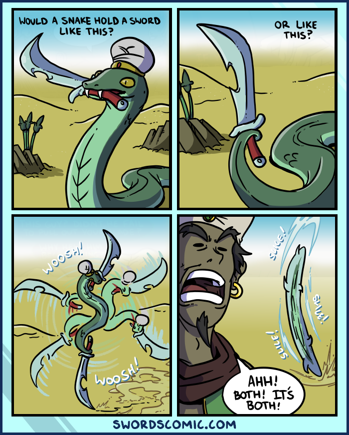 The snake starts spinning with a sword in its mouth and its tail, with a WOOSH! WOOSH! sound