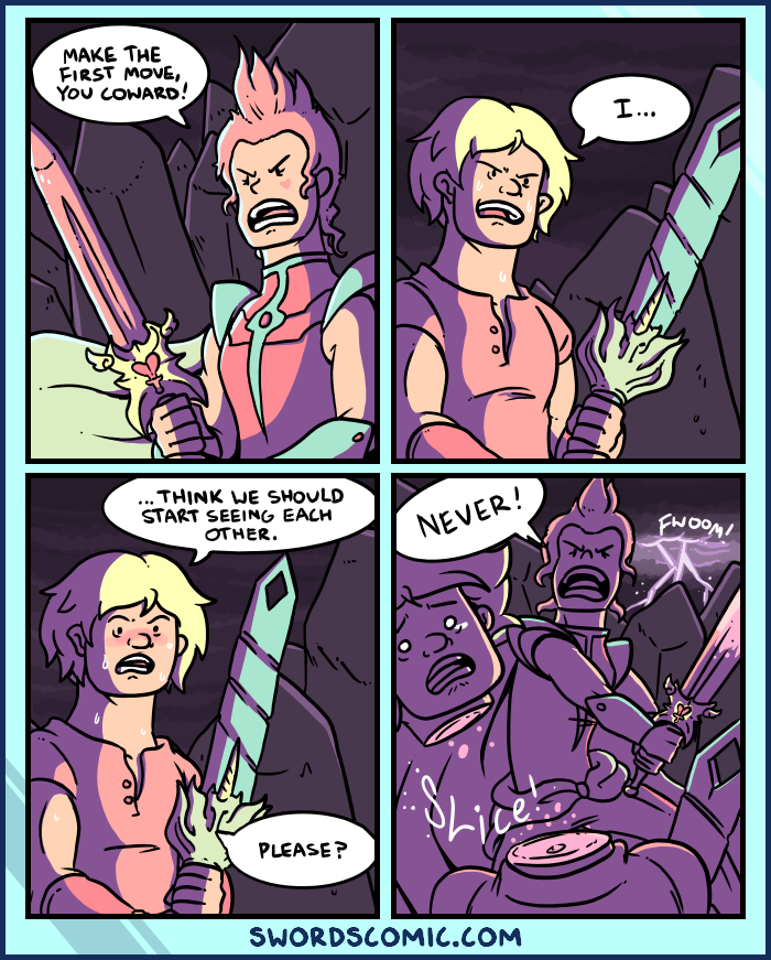 Pretty Princess cuts off Hunky Heros head while lightning FWOOMS! in the background