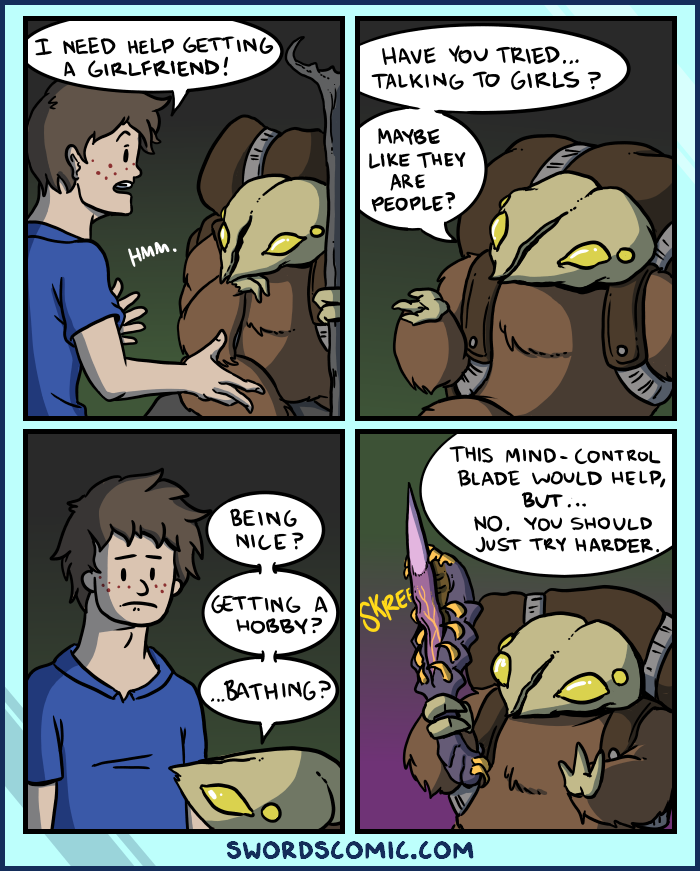 Goblin Traveller: This mind-control blade would help, but… No. You should just try harder.
